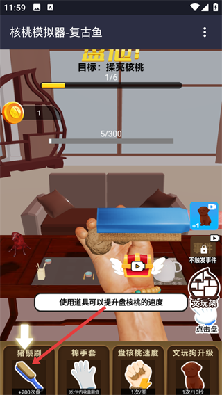 3、点击底部【猪鬃刷】道具,可提升盘核桃的速度,加快核桃包浆和揉亮进程。