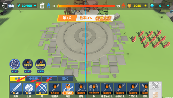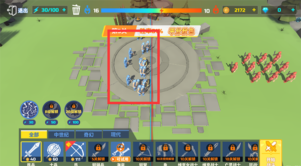 1、通过左下角点击兵种,来放置想要排布的士兵。