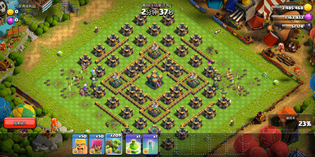 左右两边同时点屏幕,哥布林不要超过100个,弓箭手一样不要超50个,野蛮人不有超50个,等他们打完左右两个角的鸟炮,有能力的在上下同时点屏幕(和我一样单点也可以,)放野蛮人和弓箭手哥布林(哥布林最后留100个),等吧所有鸟炮打完放弹跳药水,然后两个或多个手指同时放哥布林,放完快速的在大本营边上放隐身药水,打完就差不多了。