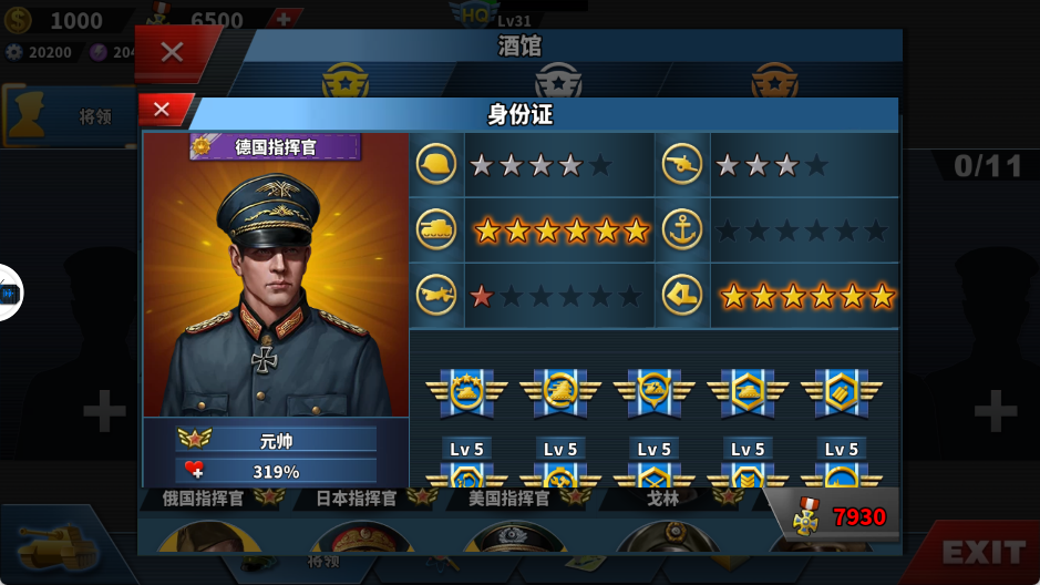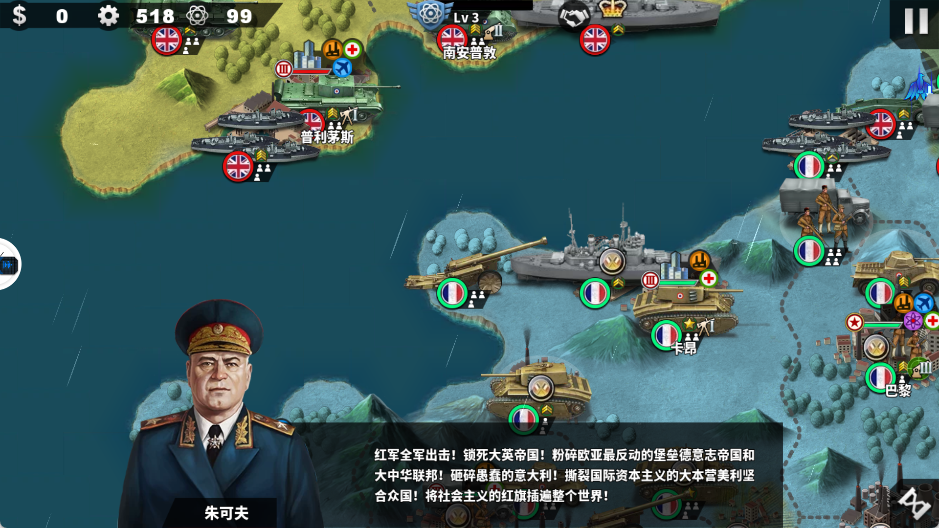 将领系统:分为铜、银、金三个档次。星级越高伤害与行动力提升越明显,适当投资军衔可显著提高坦克、步兵和空军的强度。