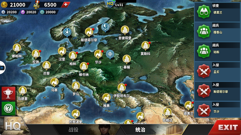 玩家从一个国家开局,利用其经济、军力与地缘优势,在300回合内夺下所有敌方城市与港口。