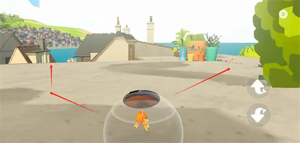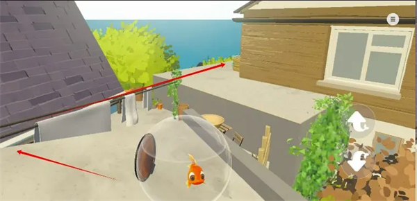 10、跟随红色箭头掉落到花丛上(否则鱼缸破碎死);然后那个缺口跳下去即可