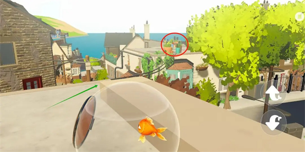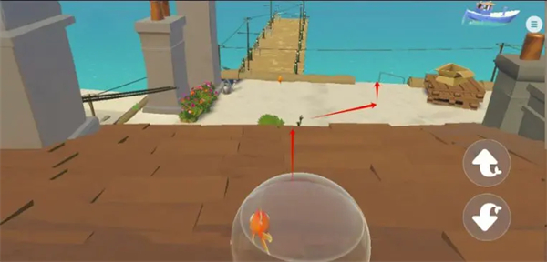 10、跟随红色箭头掉落到花丛上(否则鱼缸破碎死);然后那个缺口跳下去即可