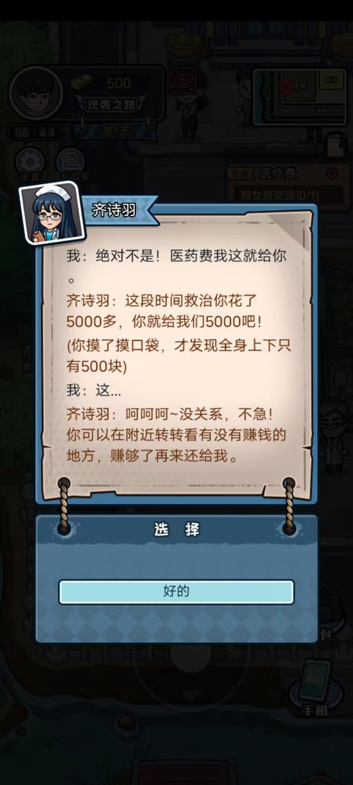 5、接下来玩家需要完成第一个任务,那就是还医药费5000块钱;