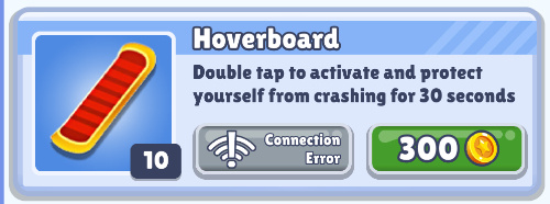 获得运动鞋后,在道具有效时间内,可以跳得比平常高。如果玩家跳的时候头碰到天花板,又没有使用滑板,游戏将会完结。