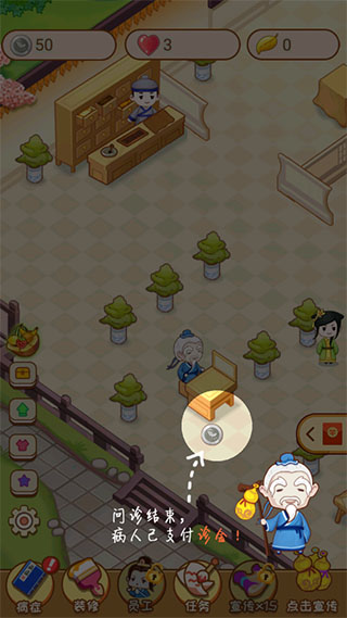 通过不断地治疗别人来获得大量的钱,扩大医院的规模,专研各项疑难杂症知识,体验到另类的江湖经营乐趣,救死扶伤并从中赚取一波收益,点击右下角的宣传可以让你的医馆拥有更多的顾客。