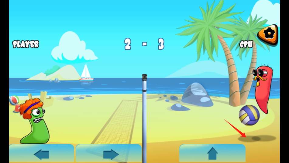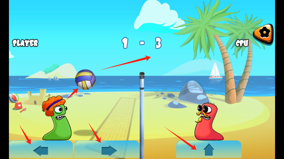 2、通过屏幕下方的三个功能按钮,灵活控制你的蠕虫角色进行移动、跳跃和击球,目标是把排球精准打向对方场地!