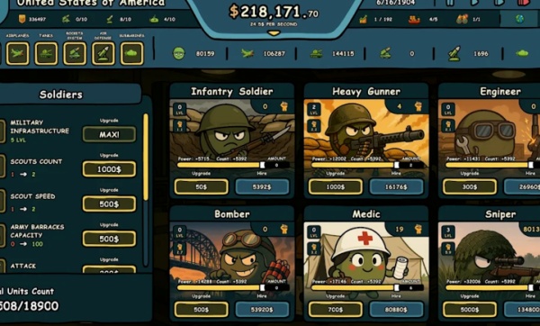 1、初始选择一个国家球作为起点,通过时间积累金币,用于升级经济或军事设施。