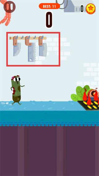 2、奔跑时躲避上方悬挂的【刀具】障碍,同时避开右侧的高温区域,避免香肠受伤影响通关。