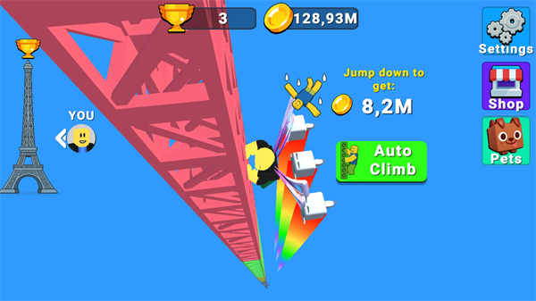2、进入游戏后前往指定的方向,去爬塔,爬到一定的高度,点击跳跃按钮直接落地就可以或去金币;