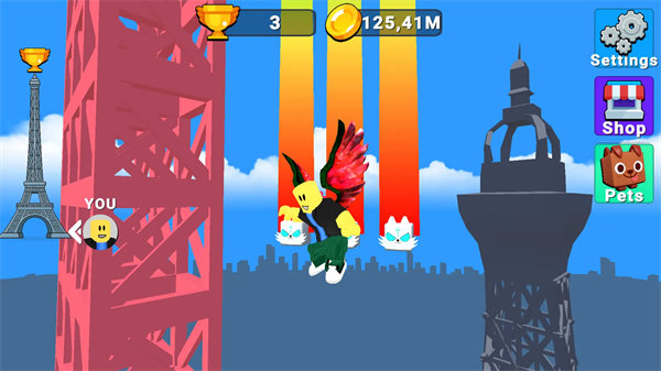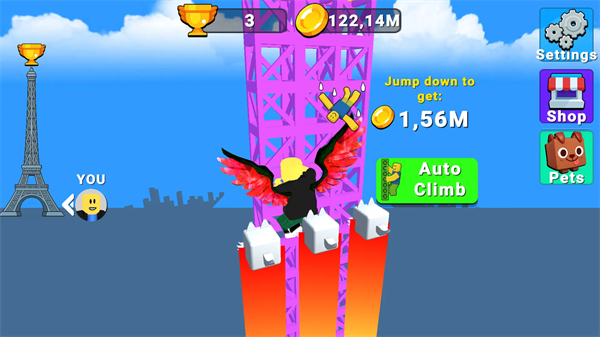奥比塔跳跃是一款以爬塔和跳跃为主题的手游,这款游戏采用方块3D画面制作,在这里玩家可以操控着小人开始挑战,在标志性建筑埃菲尔铁塔的底部一路攀升,到达顶部之后就能一跃而下并收集各种金币和奖杯,在完成挑战之后,还能解锁更多炫酷的建筑,获得各种炫酷的皮肤。