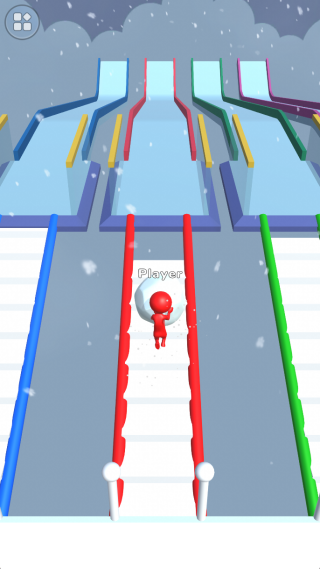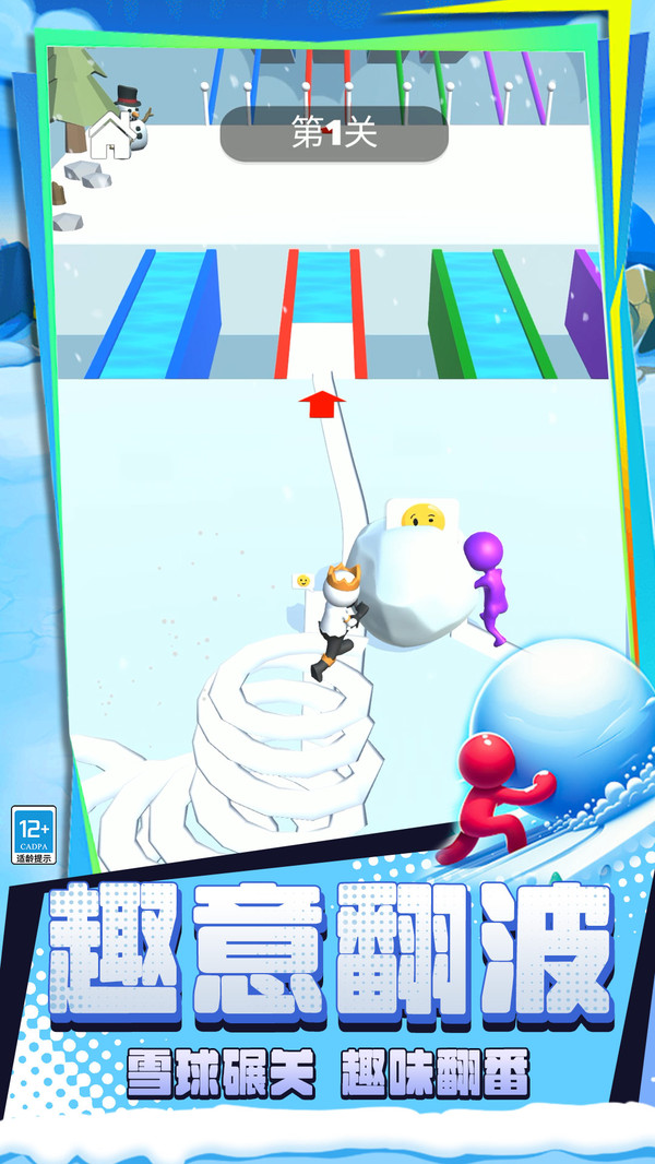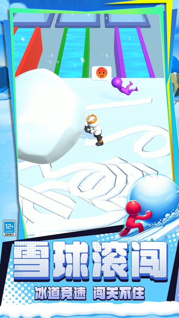 2、在蜿蜒的冰雪赛道上,玩家需与其他对手竞速。选择能高效积累雪球体积或能利用惯性实现超车的路径,是赢得比赛的关键。