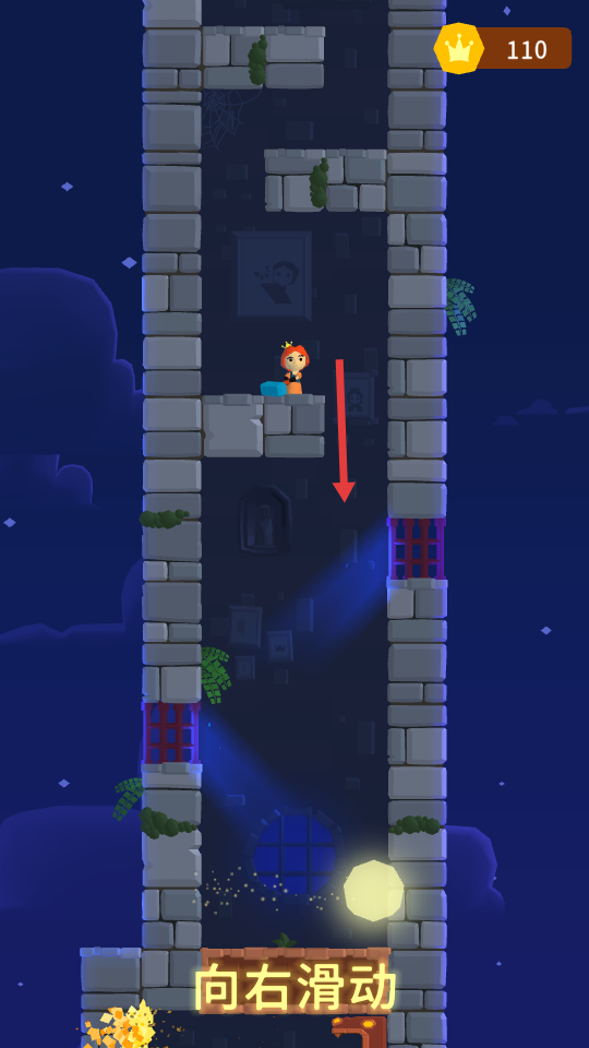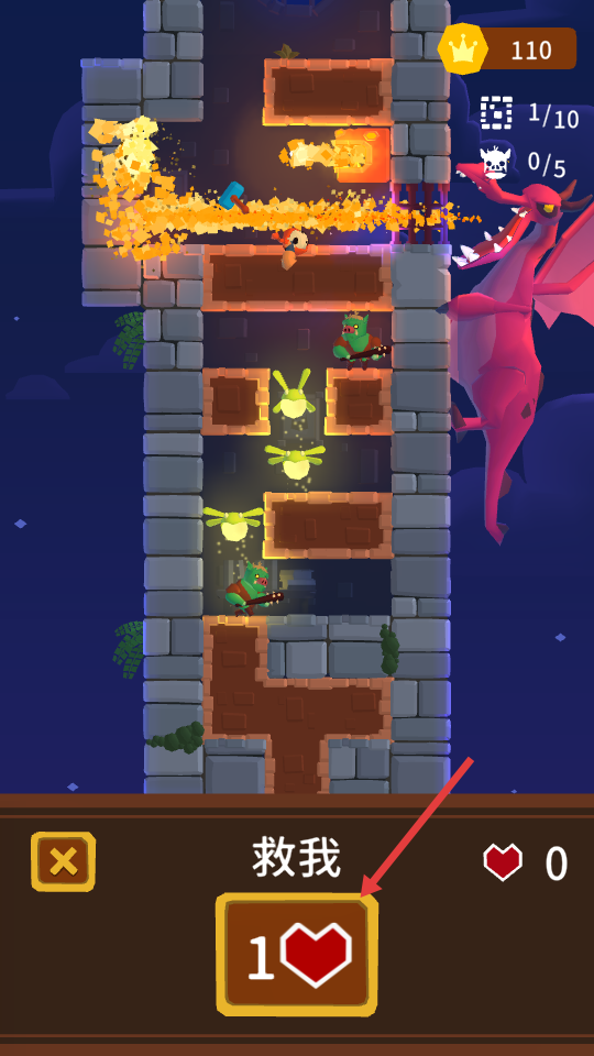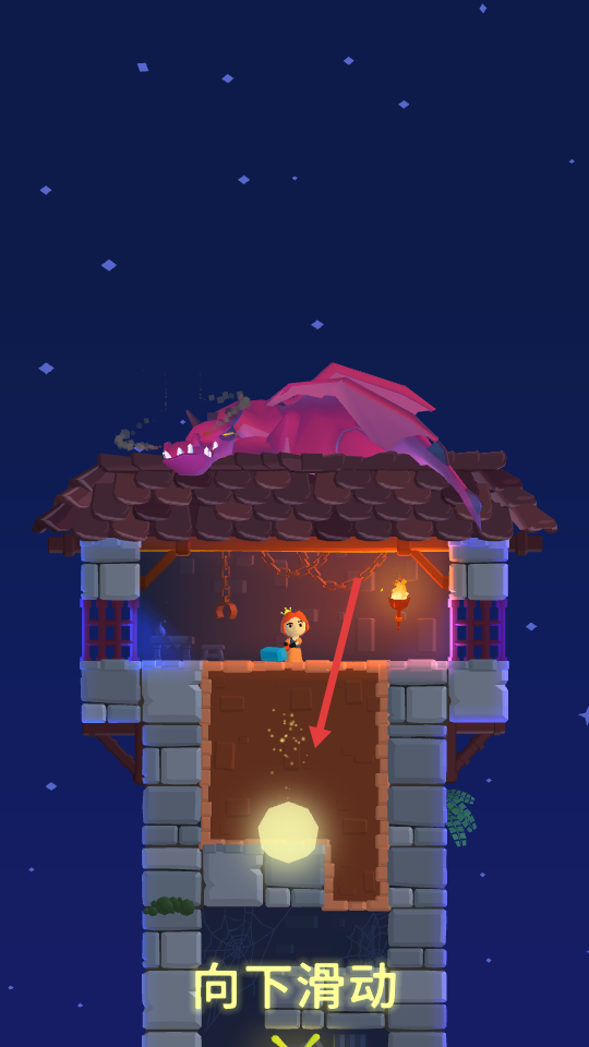 1、玩家滑动屏幕控制角色向下挖掘砖块逃离高塔同时需躲避苏醒巨龙的追击。