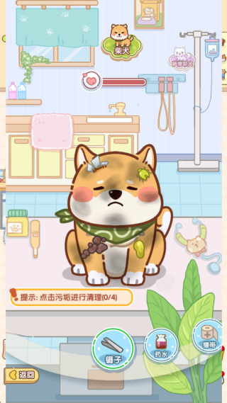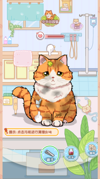 2、点击猫猫身上任何一个伤口,即可滴下药水,开始缠绷带,成功的救助宠物后开始下一个任务。