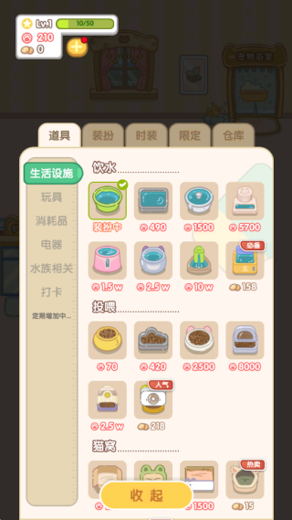 3、成功的收养猫猫,购置猫猫需要的生存物品,点击商品进行购买,点击使用道具。