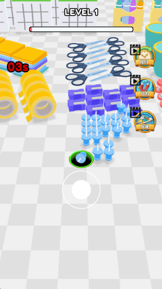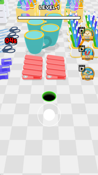 2、继续的闯关,控制黑洞继续的移动,吞噬各种工具,满足不同玩家的喜好,短时间内吞噬更多的物品。