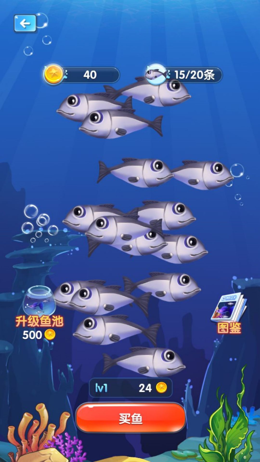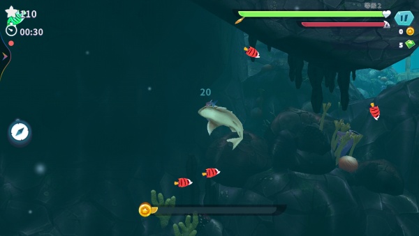 4、滑动屏幕,灵活操控你的鱼儿在水中自由穿梭,利用精准的攻击键,捕食比自己弱小的鱼类挑战闯关。