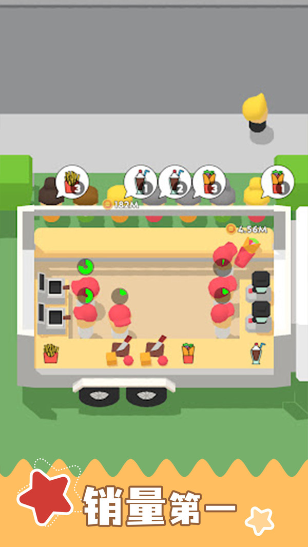 4、玩家需要管理资金流,通过销售食品赚取利润,再将利润投入于购买原料、支付薪水及扩建店铺。