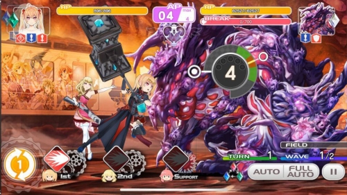 TURN是回合,代表着你经过了几次行动,WAVE是怪物波次,1/2则表示这是第一只怪,总共有两只怪AUTO是让人物自动攻击防御,不能触发额外攻击奖励,不会使用技能;FULL AUTO则是在AUTO的基础上增加了使用技能的功能。