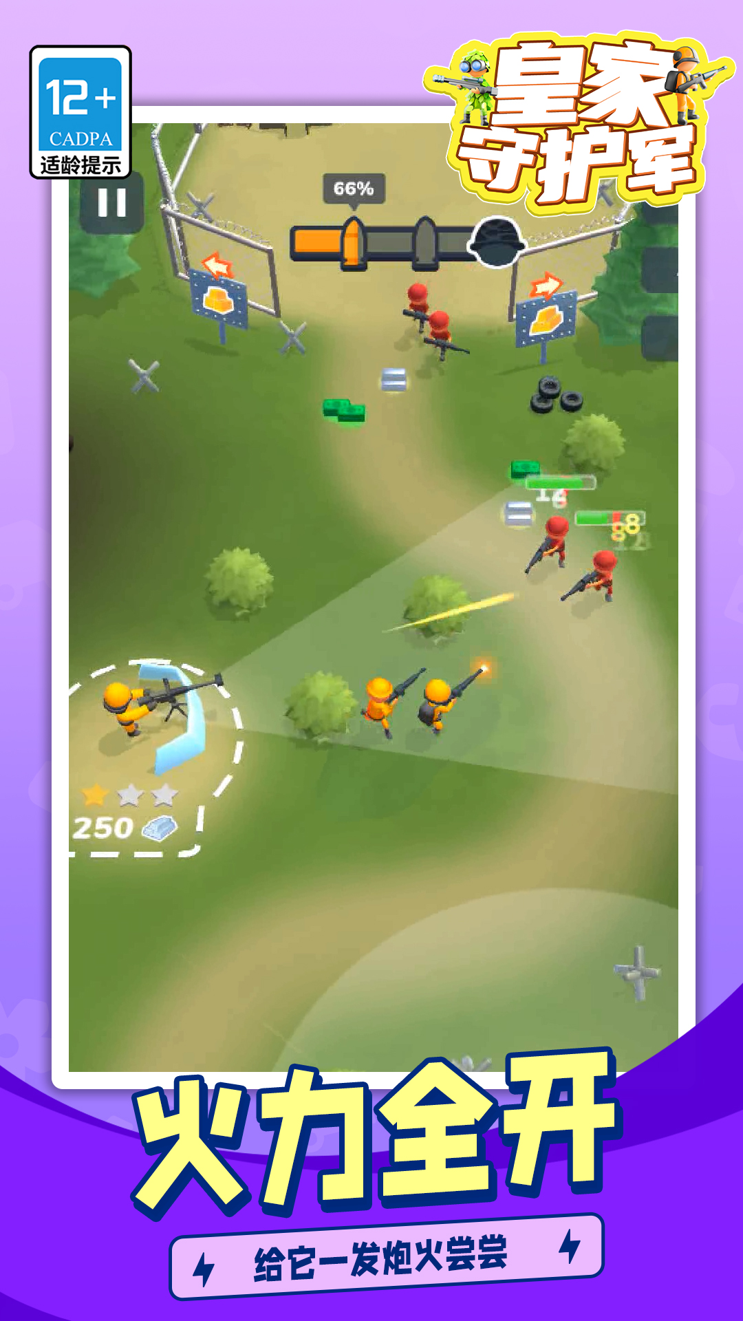 皇家守护军是一款融合塔防策略与实时射击玩法的热血军事手游。在危机四伏的战场上,你将化身前线指挥官,一手构建坚不可摧的防御工事,一手亲自操控武器火力压制来犯之敌。通过精准布局与战术操作,击退一波波敌人进攻,赢取丰厚奖励,解锁更强大的枪械与兵种。在这里,你既是运筹帷幄的防御设计师,也是冲锋陷阵的战场统帅——守护皇家基地,粉碎一切入侵者,用智慧与火力铸就不可逾越的钢铁防线!