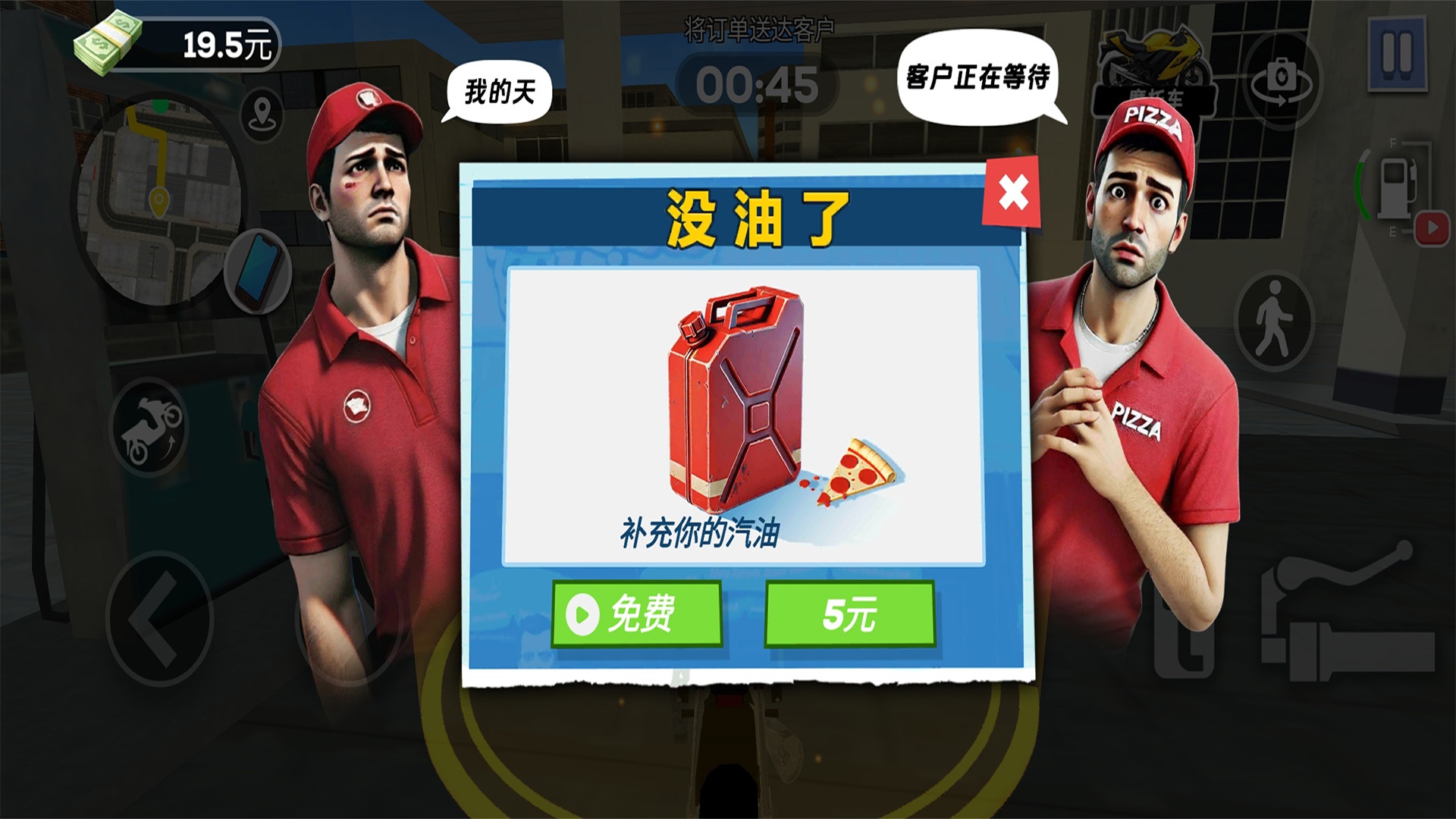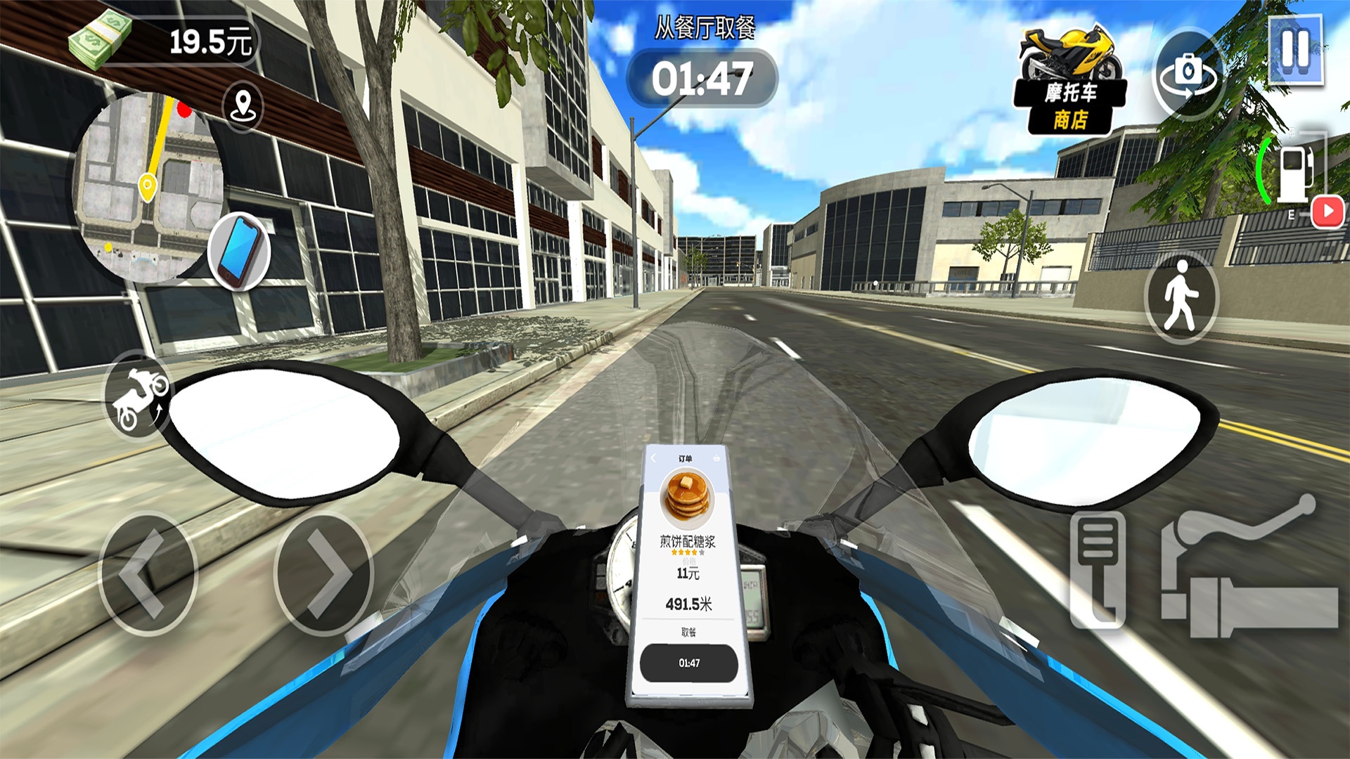 5、真实操控摩托车进行加速、刹车、转向,同时需留意燃油表,及时前往加油站补充燃油,避免因缺油而延误配送。