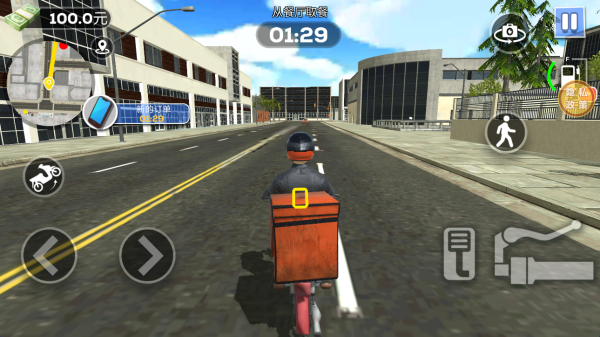 2、左侧按键控制摩托车方向,右侧控制油门以及刹车,根据左侧地图快速前往商家。