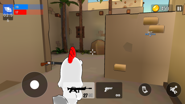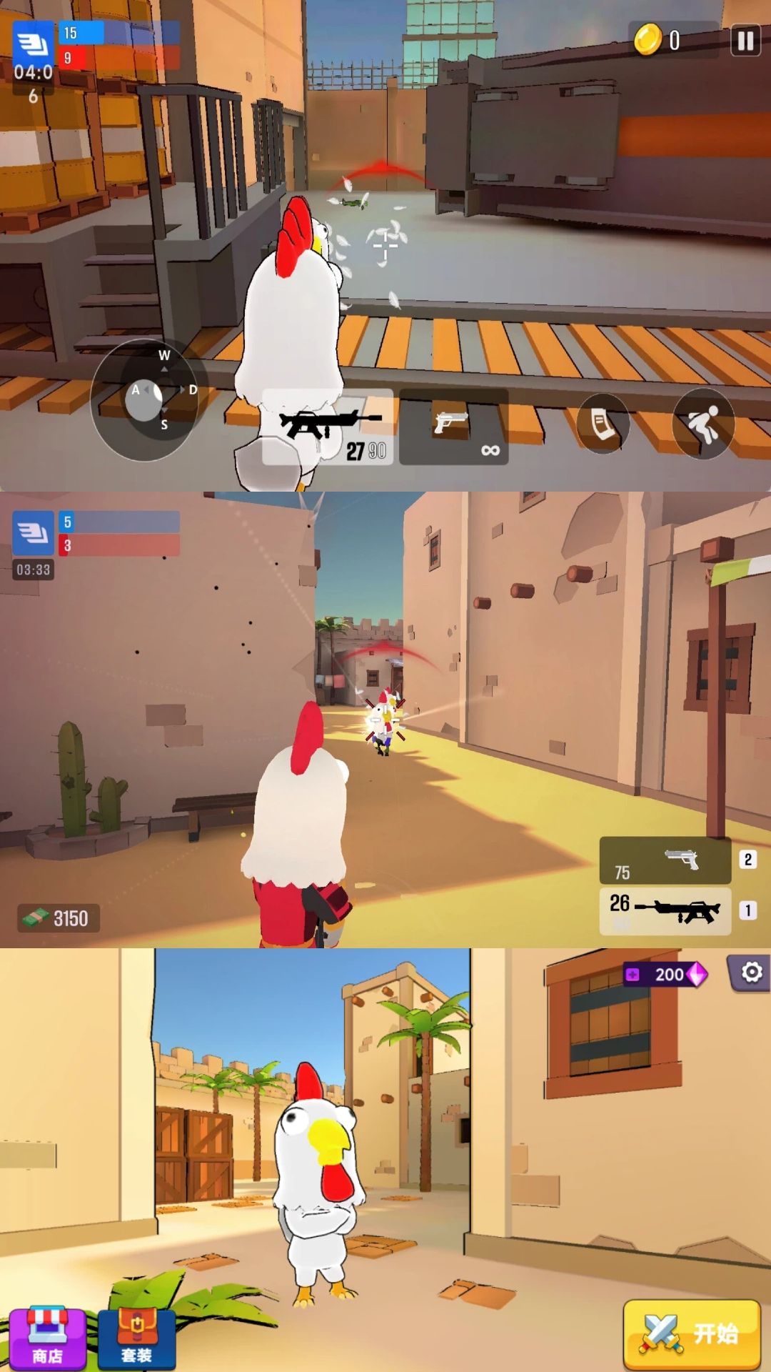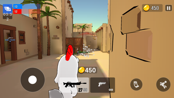 1、选择小鸡角色与初始武器进入匹配,通过虚拟摇杆控制移动,屏幕滑动调整瞄准方向。