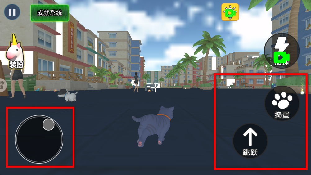 3、进入场景后,左下角用于控制猫咪移动,右下角负责触发互动行为。