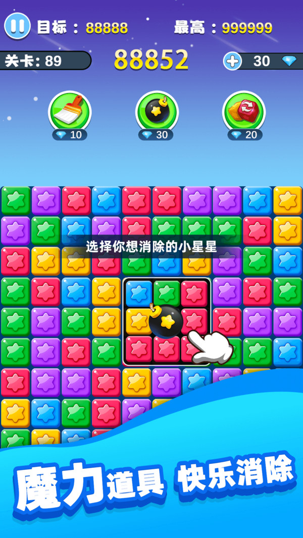 6、部分关卡要求达到指定分数,有的需要消除特定颜色的星星,还有的要在限定步数内完成目标,需采用不同策略。