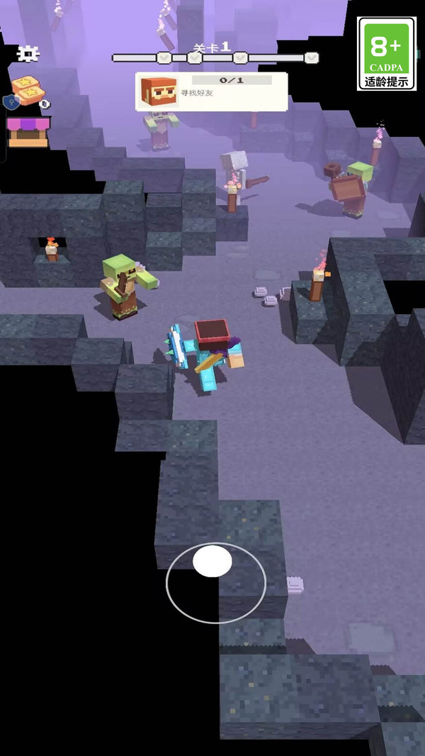 1、进入游戏,完成本关任务寻找朋友,成功的打开宝箱进入下一个世界,跟着箭头移动。