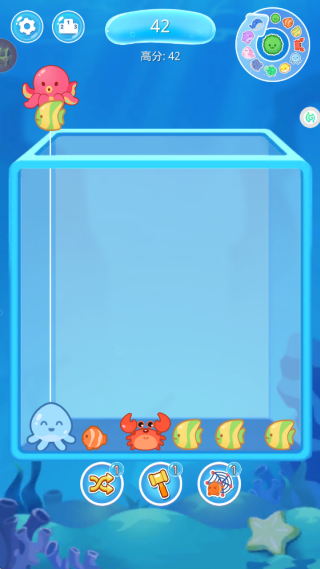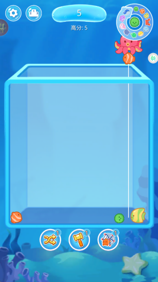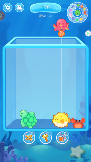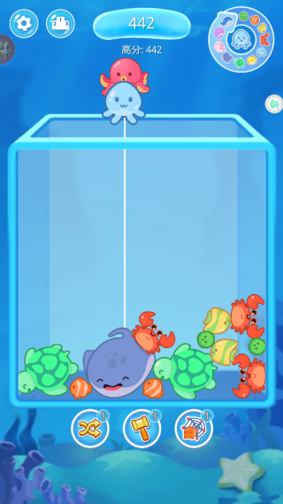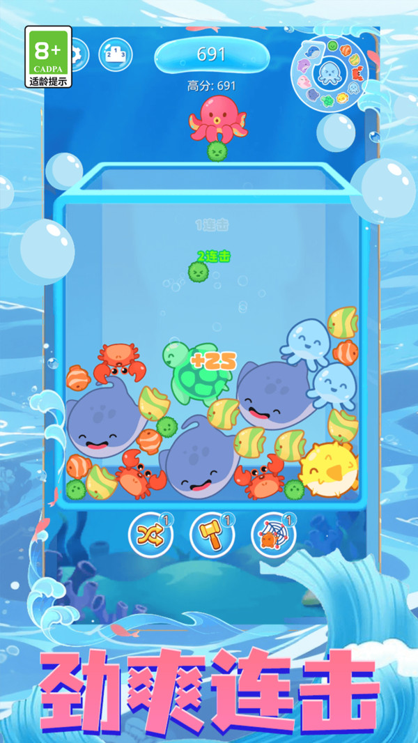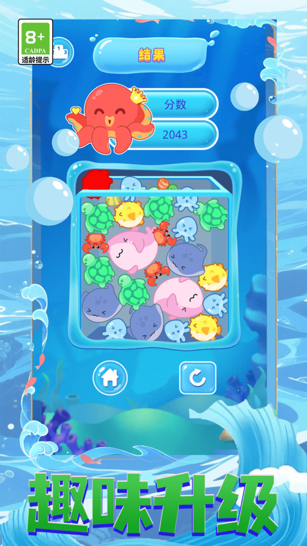 游戏以清新唯美的海底场景为舞台,玩家只需点击并移动相同的小鱼进行合成,即可触发升级反应,诞生更高级的海洋生物。每一次合成都伴随着流畅的动画与悦耳音效,带来视觉与听觉的双重享受,让整个过程既解压又富有成就感。