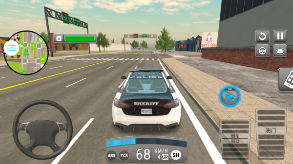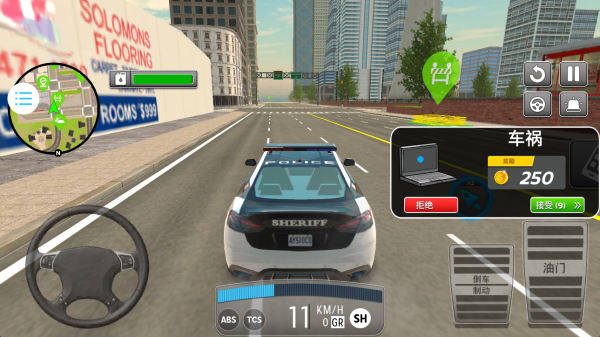 2、驾驶你的警车在城市中探索巡逻,左侧地图可以查看位置,处理各种突发事件。