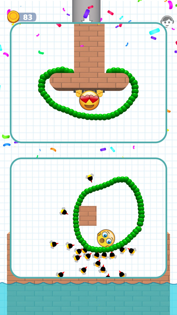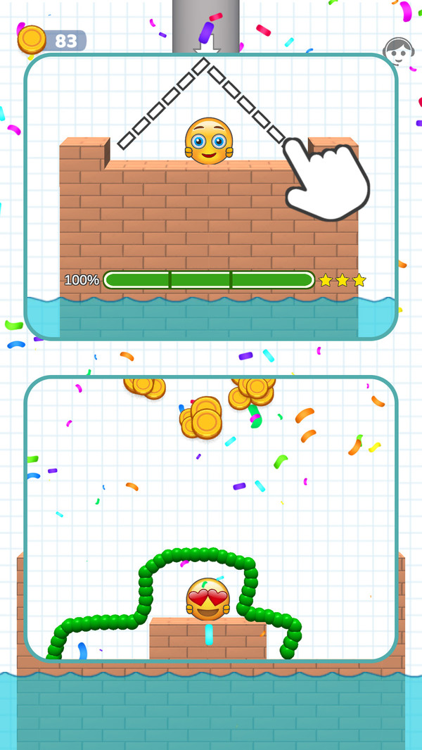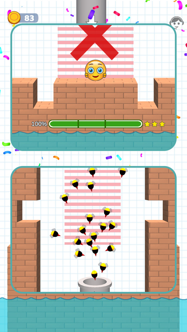 阻挡小蜜蜂是一款创意十足的休闲闯关游戏,玩家需在竖屏场景中通过绘制连续线条,巧妙阻挡蜂拥而至的小蜜蜂,保护可爱的黄豆人安全脱险。游戏画面以鲜明的视觉对比打造沉浸式体验:灰色管道、红色砖块平台、蓝色水面与网格状背景元素交织,营造出既简洁又富有层次的关卡环境。在紧张又轻松的节奏中,你不仅要精准画线防御,还需灵活运用移动平台等地形机关,规划最优逃生路径,策略与操作缺一不可。