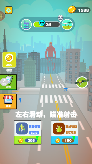 2、升级武器等级,左右滑动瞄准射击,精准的射击巨人,完成任务获取丰富的奖励。
