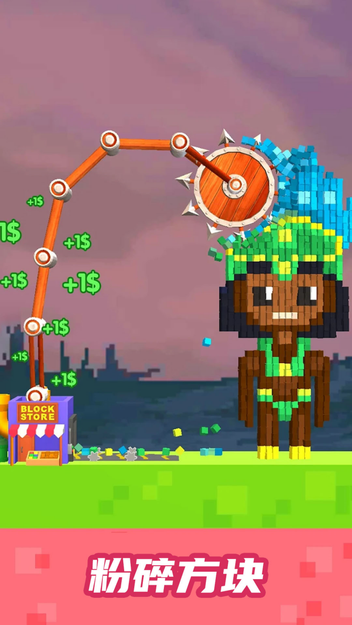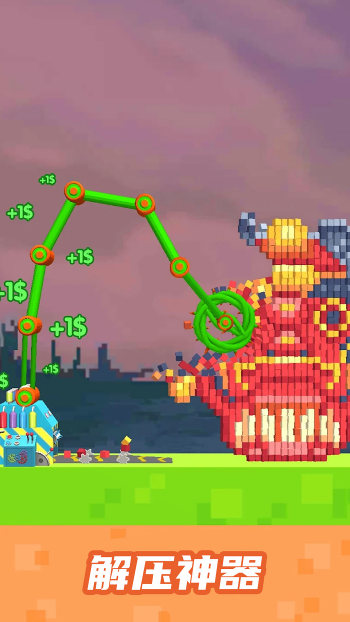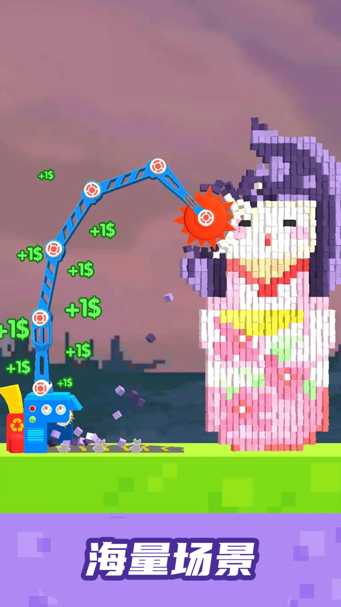 粉碎解压模拟器是一款以破坏为主题的手游,这款游戏采用简单的卡通画面制作,在这里玩家可以在简单的操作模式下控制着机械粉碎并摧毁所有可以摧毁的方块,打破的方块越多,分数就越高,还能在不同造型的各种由方块构成的目标中进行选择,在这里尽情的释放积攒着的压力。