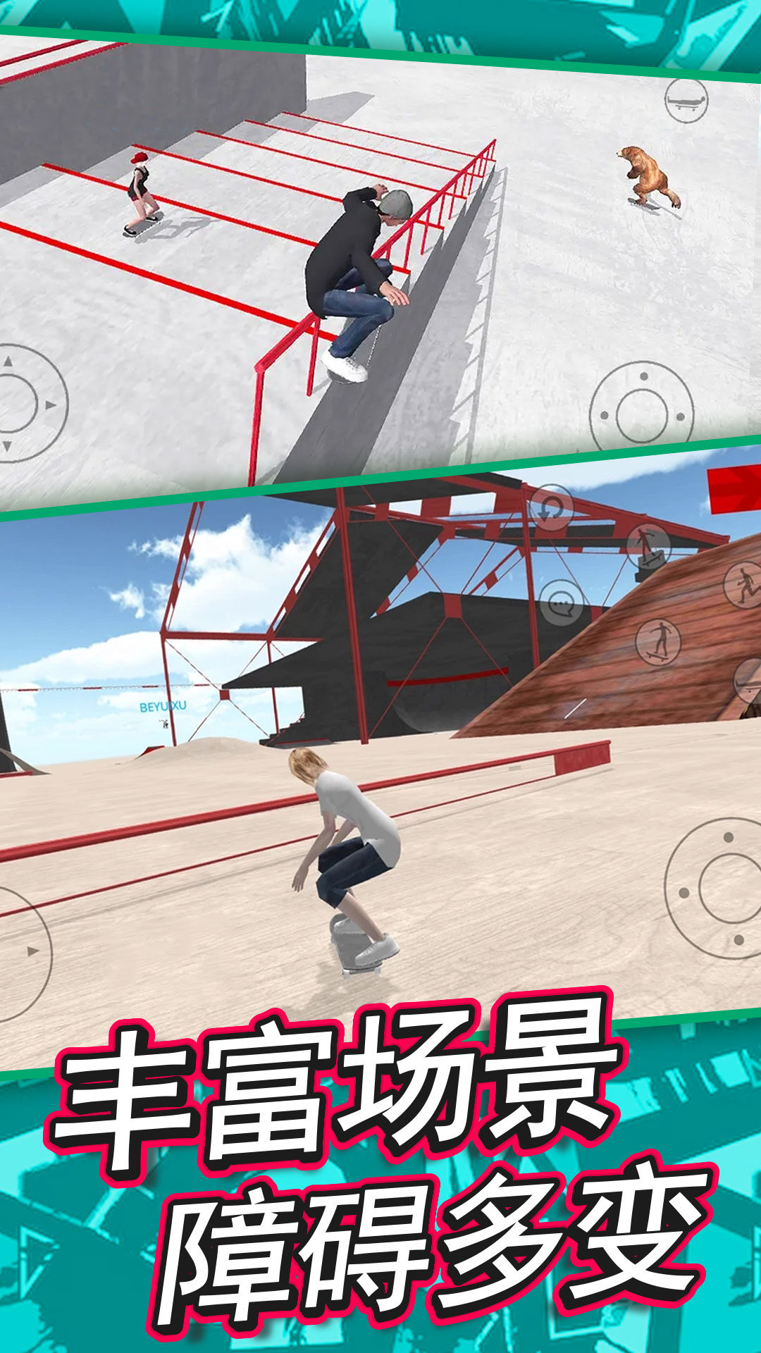 1、玩家可以做出各种滑板动作,在这里开展挑战。