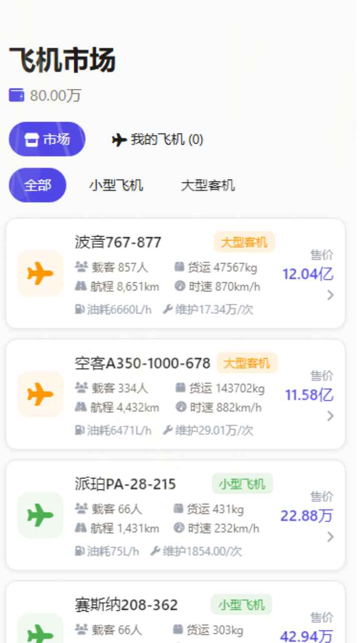飞机市场涵盖塞斯纳172、派珀PA-28等多款真实机型,各机型在载客、货运、航程、油耗、维护成本上差异显著,玩家需根据经营规划选购适配的飞机,组建专属机队。