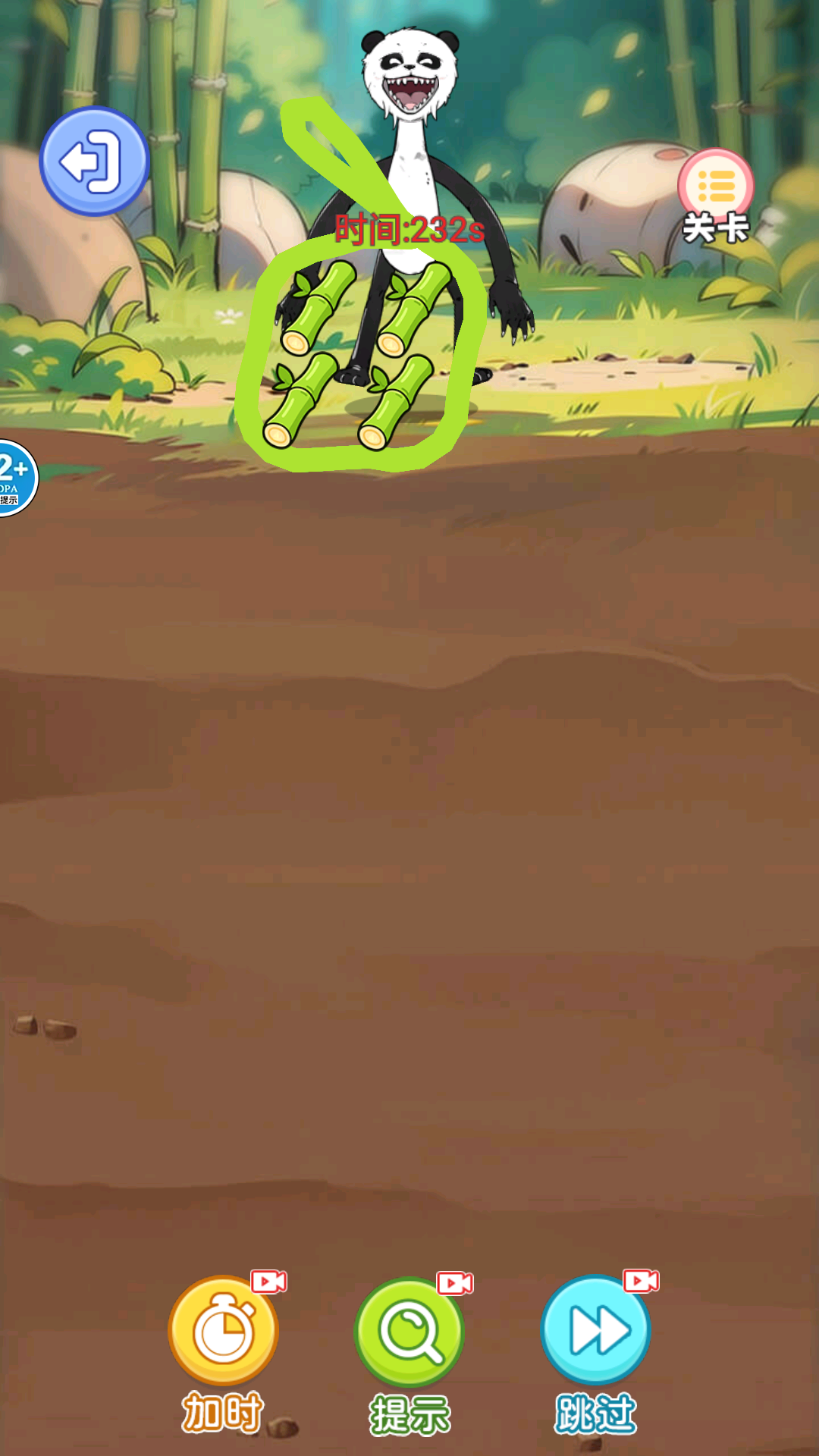 3、需在60秒内收集不同颜色竹子,同时避开石头、小河等障碍,生命值归零则游戏结束。