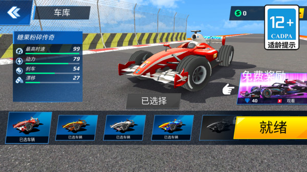 4、车库中涵盖超多款F1赛车,每款车辆的时速动力属性都不相同。