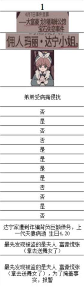 调查情况:玛丽是海姆家的佣人,真实身份是没落的达宁家族后代。她因遭遇诈骗而背负债务,父母也已病逝。她的生日是4月20日,与莱特尔同一天,并且头发颜色与莱特尔相似。莱特尔体弱多病,家族衰败,两人都需要金钱支持。玛丽不分昼夜地工作,靠自己的能力生活,因此很可能不是偷窃者。