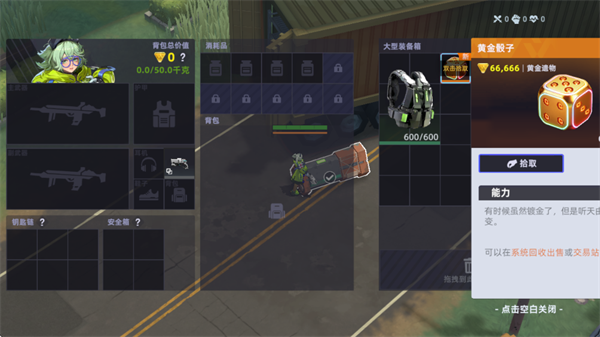 1、玩家可以通过地图中高亮处箱子搜集物资,点击右侧栏物品放入背包中。