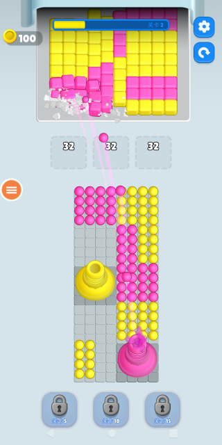 游戏基于真实的物理引擎构建,弹道轨迹自然流畅,碰撞反馈真实可信。最引人注目的是弹球在特定条件下会自动分裂成多个子球,瞬间扩大攻击范围,带来极具视觉冲击力的连锁反应效果。这种机制不仅提升策略深度,也让每局游戏充满惊喜与爽快感。