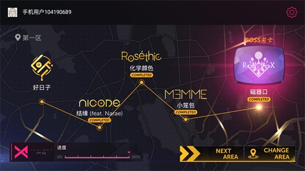 5、屏幕最上方的是歌曲进度,当进度条充满时就会结束闯关,通关后会根据玩家的分数来打出评分。