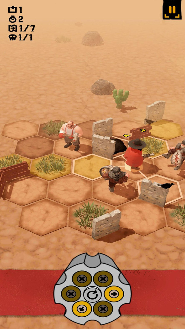 1、游戏专注于还原西部片中紧张刺激的枪手对决体验,核心玩法围绕快速拔枪、精准射击和利用掩体周旋展开。