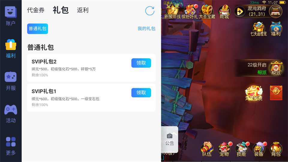 1、进入游戏后点击首页悬浮球,领取礼包兑换码