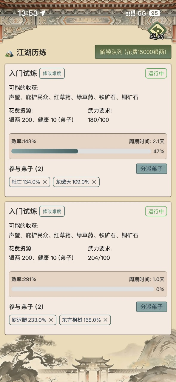 派遣弟子挑战不同难度任务,获得银两、材料和武学残篇,推动门派发展。