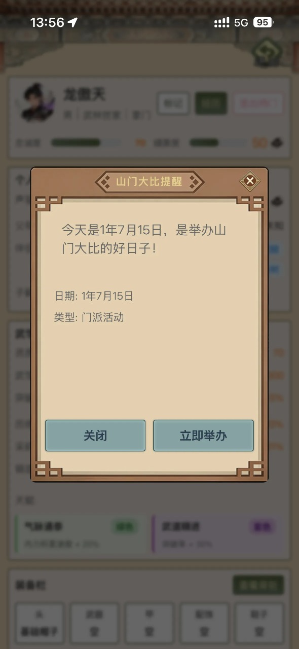门派日常、弟子纠纷和江湖邀约等事件会随机触发,每次选择都影响门派声望和未来走向。