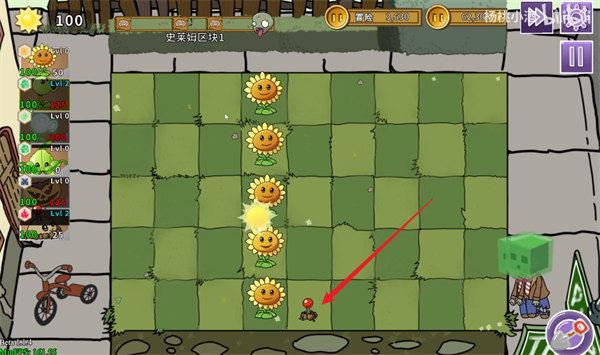 1、进入关卡后首先种植向日葵,用来持续生产阳光资源,只有阳光充足才能布置更多植物。