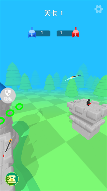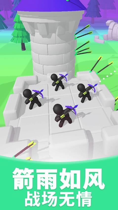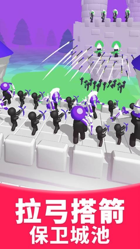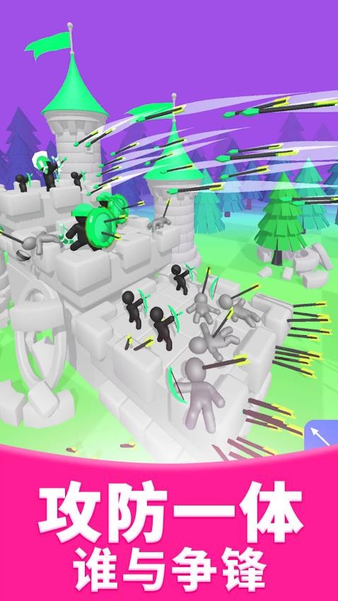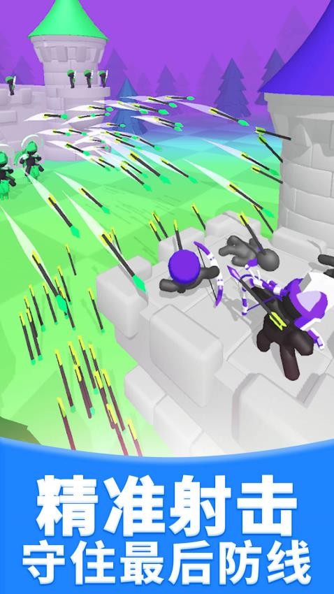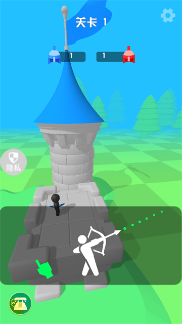 1、关卡1中,跟随指引拖动【弓箭】瞄准敌方城堡的黑色小人,调整角度发射箭矢。