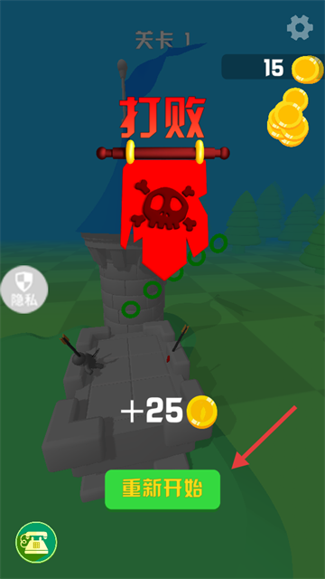 3、击败敌方后,领取【+25】金币奖励,失败可点【重新开始】再次挑战。